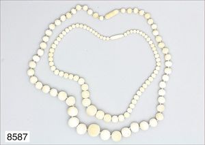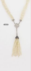 CHARLSTEN-KETTE um 1920, GG/WG 585/000, Altschliff-Diamanten & Dia-Rosen, feine Saatkorn-Perlen (geflochten), Troddel aushängbar, mit Diamanten u. Onyx (?) ausgefasst, hinten feine Schließe mit Diamant-Rosen, L. ca. 70,0 cm