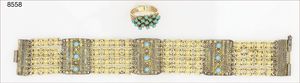 Lot: Armreif um 1880/90, Metall vergoldet deutsch/Öster., Türkise, Innenmaß: 56,5 x50,0 mm, Collier doubl. Metall, Türkise/Glas u. Perlen, 1 Paar Ohrhänger GG 585/000, Türkise/Glas u. Perlen