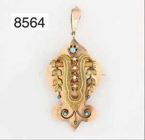 Bürgerliche Brosche als Anhänger tragbar, HISTORISMUS, Süddeutsch um 1860, sehr feine Arbeit in Gold 585/000 unterschiedlichen Goldtöne mit kleinen ½ Perlen und Türkisen, ca. H 79,4 x B 34,2, total 10,8 g, sammelwürdig !!!