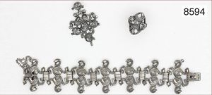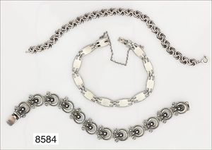 Lot: 3 Armbänder Silber, 1 x floral, 835/000, L. 18 cm; 1 x Ösen als Rosette, 835/000, L. 19,5 cm, 1 x Art-Deco Stil mit Verlängerungskettchen und Kastenschloß, 835/000, L. 18,5m