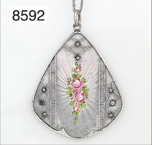 Anhänger, um 1920, Silber, feines transluszierendes Emaille mit Rosenmotiv und 8 kleinen Markasiten; Kette WG 585/000, 38 cm