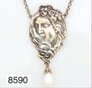 Collier, im JUGENDSTIL, Silber 925/000, 2 kleine Opale und ein Perl-Tropfen als Abschluss, L. 44,5 cm