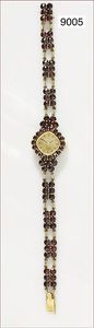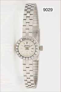 Damenarmbanduhr, RHODOS, WG 750/000, Handaufzug, Lünette mit Diamanten ausgefasst, Armband mit Spezialschließe (Brevet), Länge variabel, L. ca. 16,5 - 18,0 cm, total 33,7 g, Uhr läuft