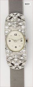 Damen Armband-Uhr, Handaufzug, amerikanisches ART DECO, in Schließe sign. STUROY, WG 585/000, mit Brillanten & Diamanten besetztes Gehäuse, ca. 0,95 ct weiß, arab. Zahlen u. Punkt Index, feines Milanese-Band mit zarter Schließe, Länge stufenlos bis 18,0 cm verstellbar, Gehäuse mit Steinbesatz ca. 46,0 x 43,0 mm, Werk wohl alt ersetzt 1930/50, Uhr läuft