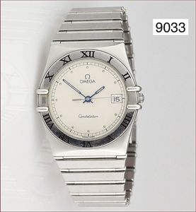 Herren Uhr, OMEGA_Constellation, Quarz, Edelstahl, Stahlband mit Faltschließe, Lünette graviert mit röm. Zahlen, Z.B. mit Punkt/ Strichindex, Datumsanzeige, Uhr läuft, D= 32,5 mm, (1 Glied muß ersetzt werden,defekt; Datumsschaltkreis läuft nicht mit), was für Bastler !