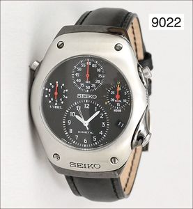 Herren Armbanduhr, SEIKO-KINETIC, Ref.: 950104, Chronograph, Gehäuse von oben verschraubt, ca. 40,5 x 47,5 mm, Lederband mit Dornschließe