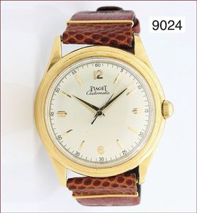 Herren Armband-Uhr, PIAGET 50er Jahre, Automatik, Gold 750/000, Zentralsekunde, Kaliber: Felsa 690, rückseitige Gravur im Deckel, Deckel mit Öffnungsspuren, Lederband mit Dornschließe, D = 36,0 mm, Uhr läuft