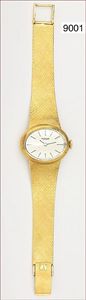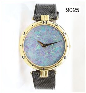Armband-Uhr, LA COLLECTIONE-MEDICI-DORO, Schweiz, Gold 750/000, ausgefallenes Opalzifferblatt, Saphirglas, Kalib. GUW 111, orig. Lederband mit Gold 750/000 Dornschließe, D = 34,5 mm, H. 4,6 mm !!!, (sehr flach), Uhr läuft, (Neupreis DM 7675,-)