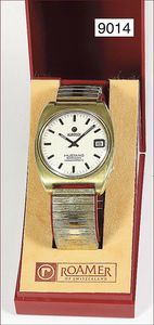 Herren Armbanduhr, ROAMER, Mustang Rotodate Indianapolis, Automatik, Mod. 471-1230 6001, Gehäuse & Band vergoldet, Boden Stahl, Zifferblatt mit Strichindex, Zentralsekunde Datumsfenster, Uhr läuft
