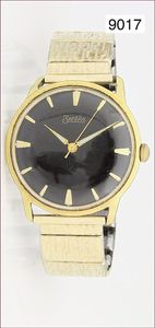 Herren Armband-Uhr, ZENTRA, goldplatet, Boden Metall, Flexband, schwarzes Ziffernblatt mit goldfarbenen Strichindex, Handaufzug, Kaliber 74, Uhr läuft