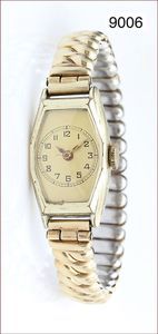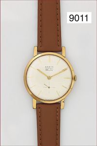 Herren Armbanduhr, DESTA Ultraflat, Swiss Made, Gehäuse & Boden 10 Mik. vergoldet, cremefarbenes Zifferblatt mit Strichindex, kl. Sekunde, Kaliber P.330, D = 34,0 mm, Uhr läuft