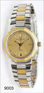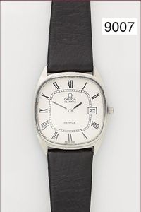 Herren Armbanduhr, OMEGA DE VILLE, Stahl cremfarbenes Ziffernblatt mit röm. Zahlen, Datumsfenster, Stahl-Zeiger teilweise schwarz abgesetzt, Omega Quarzwerk Kaliber ?? Uhr läuft (Batterie neu)