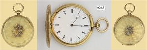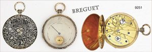 Herren-Taschenuhr mit Stunden-Digitalanzeige, auf Ziffern-Blatt sign. BREGUET, ca. 1820/30 , sehr flaches fein emailliertes Gehäuse, auf Ziffernblatt Gravur: BREGUET ECHAPEMENT A CYLINDRE ROUE TREMPE`E, QUATRE TROUS EN RUBIS, Gold 750/000, schwarz/weißes Emaille gut erhalten (an den Seiten abgeplatzt), fein gouillochiertes, silbernes Ziffern-Blatt mit Signatur: BREGUET, Fenster für die Stunden-Digitalanzeige, dezentrales Minutenblatt mit gebläutem Zeiger, vergoldetes Brückenwerk mit Zylindergang, am Gehäuse zur Krone alte Lötstelle, Schlüsselaufzug, D = 45 mm, Uhr läuft
