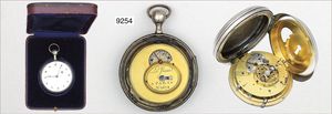 Spindel-Taschenuhr mit VIERTEL REPETITION um 1820, glattes Silbergehäuse, Rückseite dez. graviert, gut erhaltenes E.Z.Blatt mit arab. Zahlen, Kettenaufzug, schöner Zustand mit orig. Schatulle, D = 52,0, Uhr läuft