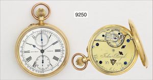Herren-Taschenuhr, Chronometer/ Tachymeter: JOHN BOYD GLASGOW, schönes original Goldgehäuse 750/000, sehr gut erhaltenes E.Z. Blatt mit röm. Zahlen, kl. Sekunde, Glas mit leichten Abplatzern, Breguetspirale, Gravur auf Zwischen-Boden: C. A. BELDAM, FROM HIS FATHER AND MOTHER, OCTR. 15 TH 1890, Ankerwelle gebrochen, Rep. Bedürftig, D = 50,0 mm
