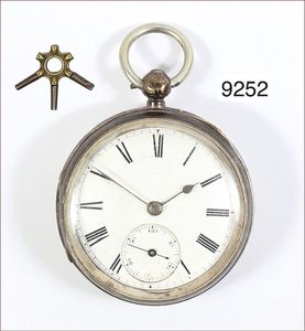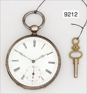 Herren Schlüssel-Taschenuhr, Silber, glattes Gehäuse, fein gravierte Rückseite mit Gouilloche und Blumendekor, E.Z. Blatt mit röm. Zahlen, grazile Zeiger, kl. Sekunde Zylinderwerk, 8 Steine, D = 46,5 mm, 1 Schlüssel, Uhr läuft