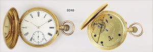 Englische Herren Taschenuhr mit Sprungdeckel um 1900, glattes Goldgehäuse 750/000, Signatur auf Platine: Bracebridges Clerkenwell London Nr. 7768 sehr gut erhaltenes E.Z. Blatt mit röm. Zahlen, kl. Sekunde, goldene Zeiger, Spitzzahnhemmung, Goldankerrad, geschnittene Unruhe mit Flachspirale, Werk verg. Hallmarks, sehr guter Zustand, (Aufhänge-Bügel ersetzt, Gold 375/000), D = 48,6 mm, Uhr läuft