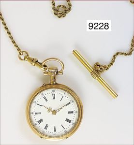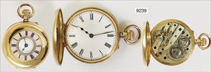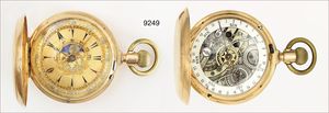 Ungewöhnlich franz. Gold-Taschenuhr (unbezeichnet), glattes 750/000 Goldgehäuse, doppelter Sprungdeckel, sehr gut erhaltener Emaille-Kranz, 1 Zeiger lose, Rückwertig interessanter Kalender mit Mondphase, Tag und Datum, Ankerwerk mit Breguetspirale, wohl für den arabischen Markt gefertigt, läuft nicht ab, Revision notwendig, D = 49,5 mm