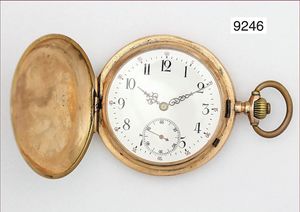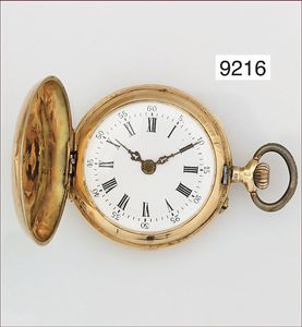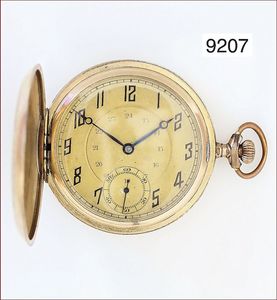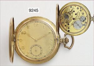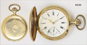 Half Hunter um 1910, glattes Goldgehäuse 750/000, sehr gut erhaltenes E.Z. Blatt mit röm. Zahlen und gebl. Zeigern, geschnittene Kompensations-Unruhe & Breguetspirale, Emaille im Deckel im Perfektem Zustand, D = 35,5 mm, läuft an, Reinig. bed.