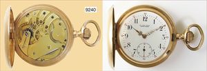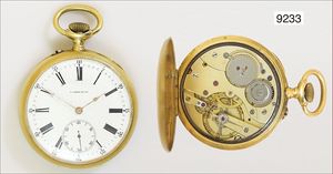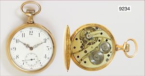 Herren Gold-Taschenuhr, Schweizer Uhr nach dt. Vorbild, reich graviertes Goldgehäuse 585/000, Z.B. Metall, (Gehäuse seitlich mit Druckstelle), sehr gut erhaltenes E.Z. Blatt mit arab. Zahlen, kl. Sekunde, ¾ Platine Nr.26167, eingelegte Ankerpalette (System Glashütte ?), Breguetspirale, D = 51,0 mm, Uhr läuft