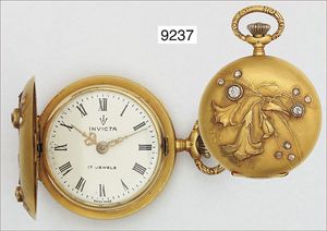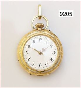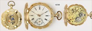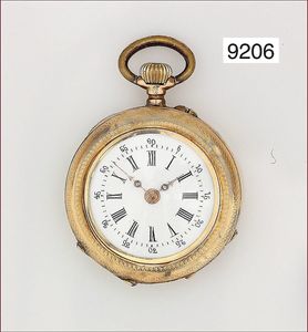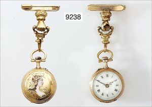 Damen Zylinder-Taschenuhr, mit abnehmbarer ausgefallener Broschierung, verziertes Goldgehäuse 750/000,(Kronenvergoldung mit leichten Abplatzern, leichte Delle seitlich am Gehäuse), sehr gut erhaltenes E.Z.Blatt, dez. mit Gold hinterlegt, röm. Zahlen, Rückseite mit emailliertem und graviertem Damen Profil, 4 Diamantrosen (1 fehlt) D = 24,2, H. 68,5 mm