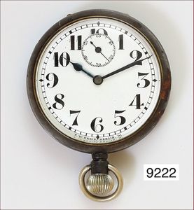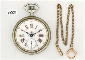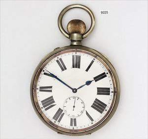 Ungewöhnlich große Metalltaschenuhr um 1900 (Eisenbahner Uhr), 8-Tage-Werk, großes Federhaus, dezentrales Minutenrad, glattes Gehäuse, sehr gut erhaltenes E.Z.Blatt mit röm. Zahlen, kl. Sek., gebläute Zeiger, ( Glas auf 7 Uhr beschädigt), D = 103,0 mm, Uhr läuft