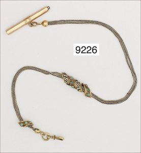 Uhrenkette & Anhänger, 750/000, Anhänger mit Heliotrop und rot-braunem Achat ausgefasst, an den Enden 1 Karabiner und Federring, zusätzlich Knebel eingearbeitet, L. 39,5 cm, total 62,2 g