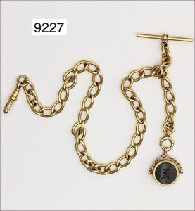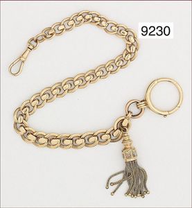Uhrenkette im Verlauf, 585/000, Troddel als Anhänger, an den Enden 1 Karabiener und 1 großer Federring, L. 27,0 cm, total 25,6 g