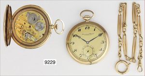 IWC Gold-Taschenuhr (826248), ART DECO um 1920, sehr flach, Uhren-Kette 750/000, glattes Goldgehäuse 585/000, Rückseite gradlinige Gravur, Z. Boden Metall, (Gehäuse kl. Druckstellen) sehr gut erhaltenes Ziffernblatt mit Firmensignatur, arab. Zahlen, kl. Sekunde, gebl. Zeiger, Schwanenhals-Feinregulierung, Breguetspirale, D = 58,8 mm, sehr schöner orig. Zustand, mit schwerer GG 750/000 Uhrenkette (22,2 g), Federring& Karabiner, L. 32,0 cm, Uhr läuft