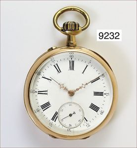 Zylinder-Taschenuhr um 1900, glattes Goldgehäuse 585/000, Vergoldung an Krone teilweise abgepl., E.Z. Blatt mit röm. Zahlen, feiner Haarriss, kl. Sekunde, D = 44,0 mm, Uhr läuft