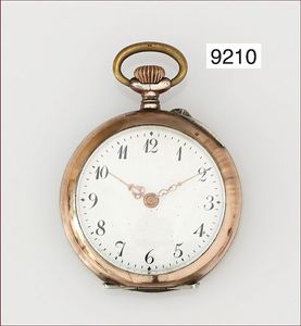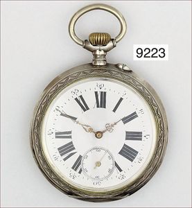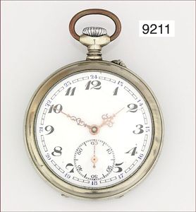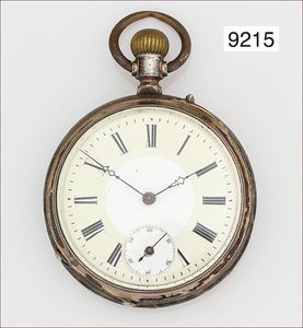Herren Taschenuhr, Metall, glattes Gehäuse, fein gravierte Rückseite mit Wappenschild, E.Z. Blatt mit arab. Zahlen() feiner Haarriss, feine Zeiger, kl. Sekunde Zylinderwerk, 6 Steine, D = 43,5 mm, Uhr läuft