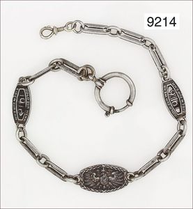 Eiserne Taschenuhren-Kette, 3 Schilder mit Inschrift, 2 x Gold zur Wehr Eisen zu Ehr 1916, 1 x in eiserner Zeit 1916 mit Adler auf der Rückseite, 1 x Federring, 1 x Karabiner (Silber), L.30,5 cm