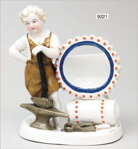 Taschen Uhrenständer Porzellan Böhmen um 1890, farbig gefasst, Schmied mit Hammer und Amboß, H. 13,5 cm, B.12,0 cm