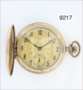 Herren Gold-Taschenuhr mit Sprungdeckel, glattes Goldgehäuse 585/000, Gouillochierung abgetragen, Z.B. Metall, gut erhaltenes E.Z. Blatt mit röm. Zahlen, kl. Sekunde, Breguetspirale, 15 Steine, D = 50,0 mm Werkshersteller G & S, Uhr läuft
