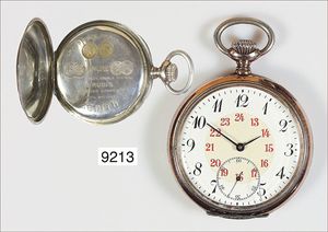 Taschenuhr, ZENITH, Grand Prix Paris 1900, Silber 800/000, Rückdeckel mit Guilloche, Wappengravur, Ränder verg., E.Z. Blatt sehr guter Zustand, arab. Zahlen(Außen schwarz, Innen rot), kl. Sekunde, Zeiger sekundär, Glas leichter Riss, D = 49,0mm, Uhr läuft