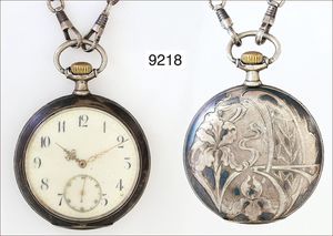 Herren-Taschenuhr, JUGENDSTIL, Tulla-Silber 800/000, mit orig. Kette, Ankerhemmung, Brequetspirale, 15 Rubine, arab. Zahlen, kl. Sekunde auf 6 Uhr, Glas stark verkratzt, Tulla altersbedingt abgetragen, D =52,5, Uhr läuft