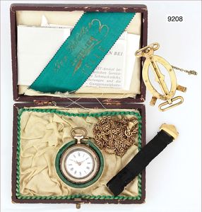 kl. Damentaschenuhr um 1900 mit Originalschatulle, Uhrenhalterung für Armband, Schließe mit ½ Armband( Stoff) und einer verg .Kette mit Karabiner, glattes Gehäuse, Zw.Boden Metall, Silber 800/000, Rückseite graviert mit floralem Dekor und Wappenschild, Rand verg. E.Z. Blatt(feiner Riss) mit arab. Zahlen, feine Zeiger, Zylinderwerk, 31, D = 30,5 mm, Uhr läuft