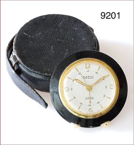 Reisewecker 70er Jahre, ALERTIC (Saint-Blaise), Swiss Made, 17 Rubine, Handaufzug, Metall, Kunstoff (schwarz), Original Lederetui, D= 42,5 mm, Uhr läuft