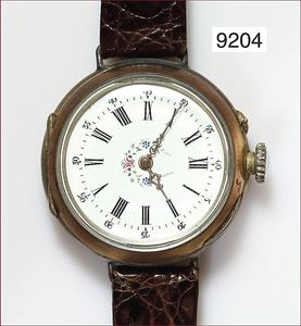 Taschenuhr (als Armband-Uhr umgearbeitet), um 1900, Silber 800/000 vergoldet, Zylinderhemmung, gut erhaltenes Emaille-Ziffernblatt, Krone sekundär, Krokoband, D = 33,5 mm, Uhr läuft