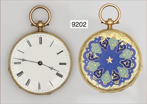 Damen Schlüssel-Taschenuhr, Gold 750/000, E.Z.Blatt , röm Zahlen, feine Zeiger, D = 38,0 mm, Rückseite emailliert (teilweise abgeplatzt)
