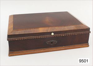 Holzschatulle mit Scharnier, u.a. Nußbaum, um 1860/1870, Knopf aus Bein, Innen mit alter Papiertapete ausgeschlagen, ohne Schlüssel, ohne Einsatz, ca. L 29 cm, H 6,0, T 21,0 cm