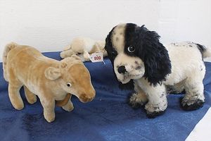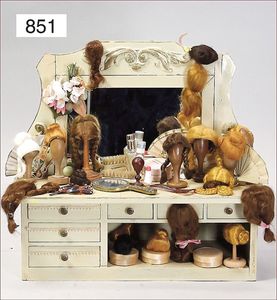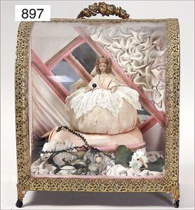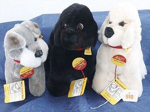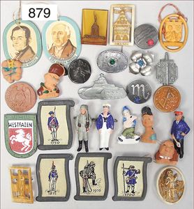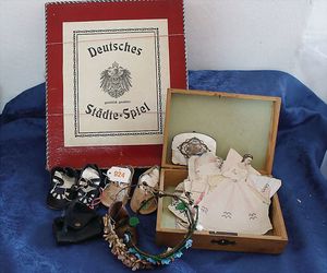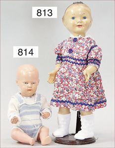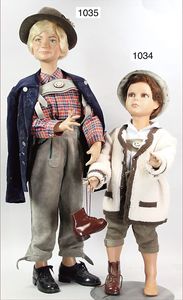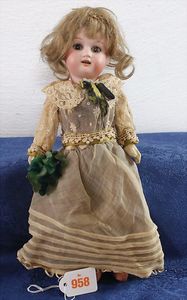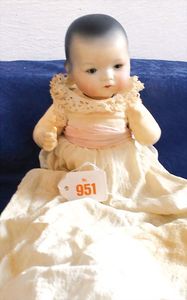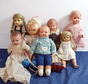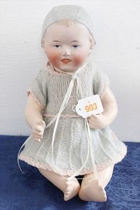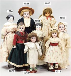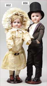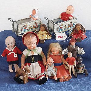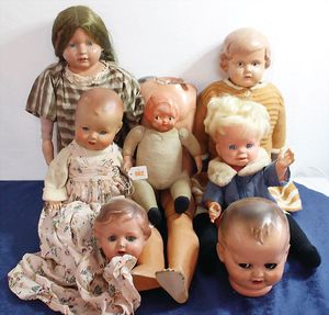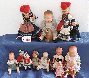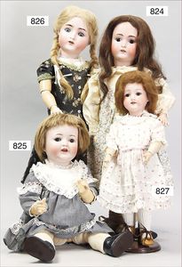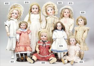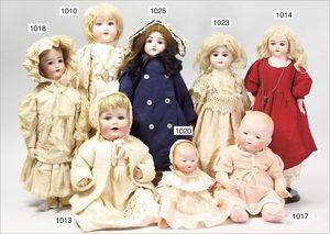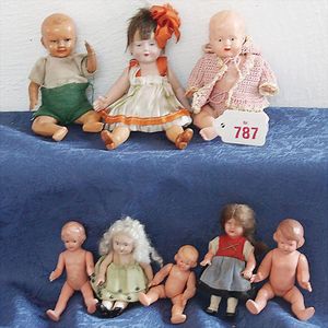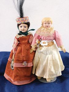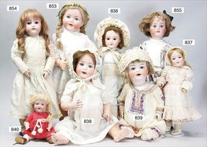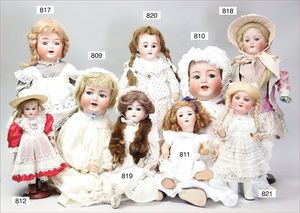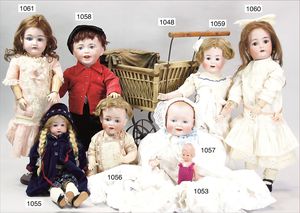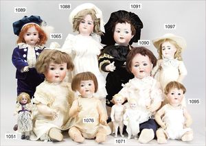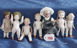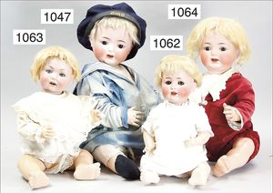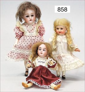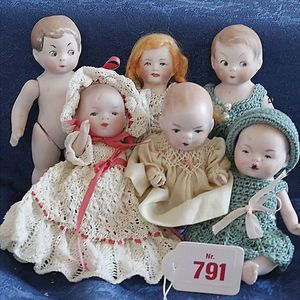 3 kl. Porzellan-Puppen, 1 x Gebr. Kühnlenz, fest eingesetzte Glasaugen, off. Mund, Zähne, Echthaarperücke, Masse-Stehkörper, 15 cm, 1 x gemarkt 155/5, braune Schlafaugen, off. Mund, Zähne, Mohairperücke, Masse-Stehkörper, 18 cm, 1 x gemarkt Germany 390, braune fest eingesetzte Glasaugen, Mohairperücke, Masse-Stehkörper, alle mit anmodellierten Schuhen u. Strümpfen, 15 cm