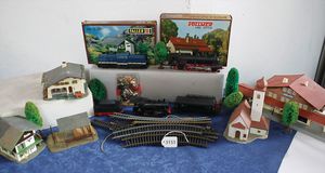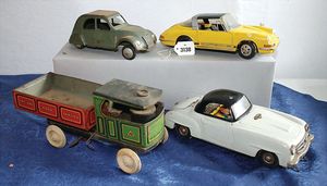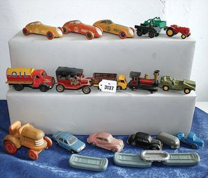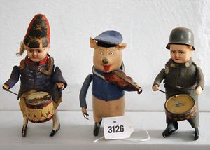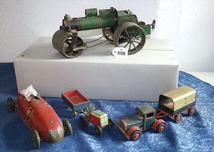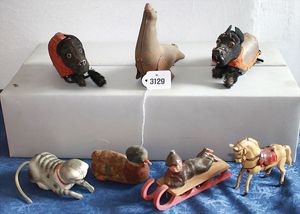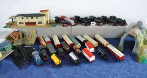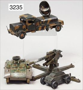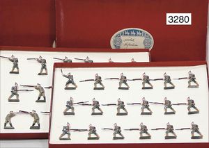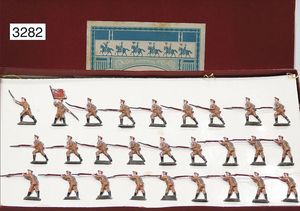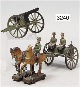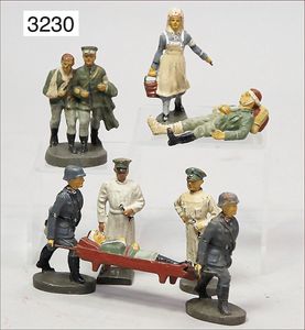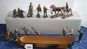 12 Teile Elastolin, 2. Weltkrieg, Masse, 7,5 cm, marschierend, dazu 13 Teile ungem., 1 Gleitwerk, TippCo, mit Emblem, meist Zust. 2-3, 3 Figuren Elastolin, stillgestanden, 1 General, Lineaol, 4 Figuren kämpfend, 1 Wärterhaus, 1 paar Teile beschädigt