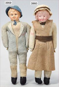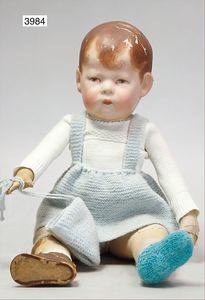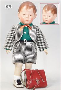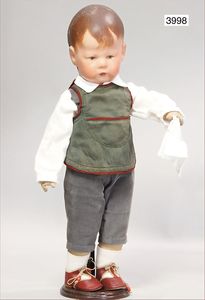 MINERVA Bischof u. Beck, 20er Jahre, Celluloid-Einbindekopf-Puppe, Junge, mit aufgemalten Schnurrbart, fein ausmodellierte Haare, Orig.-Filzkörper, Orig.-Filzkleidung, 22,5 cm