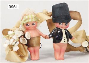 Kewpie, Hochzeitspärchen, Karl Standfuss, 20er Jahre, Celluloid, je 6 cm, Bräutigam mit gemalter Kleidung, Orig.-Ausstattung, Klebestelle unter den Fußsohlen, selten
