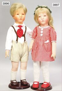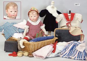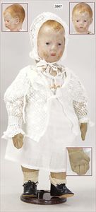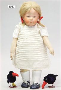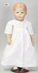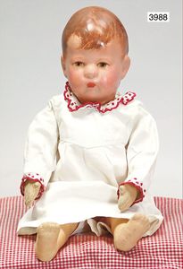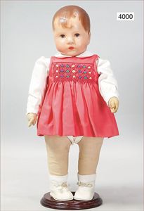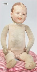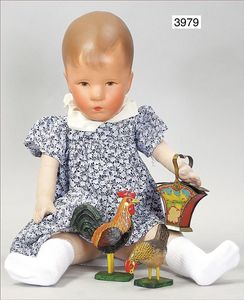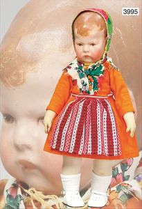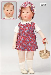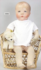 KÄMMER & REINHARDT "Baby Bauz",1. Käthe Kruse Puppe, gefertigt unter dem Namen K & R, Vorläufer der Froschhand, wurde gefertigt Anfang 1911, 44 cm, Stoffkopf, 3 Hinterkopfnähte, dünne Bemalung, extrem breite Hüfte, mit stämmigen Waden, breite Hand, Orig.-Zust., Kopfnaht hinten 1 x nachgenäht, Nasenspitze etwas berieben, absolut selten, mit Orig.-Zertifikat von Sabine Reinelt