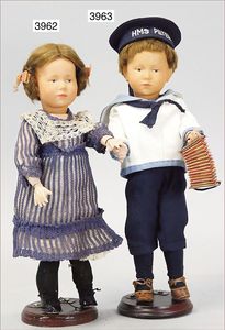 KÄMMER & REINHARDT Peter, ca. 1910, Celluloid-Kurbel-Vollkopf, Markierung SoR K&R 701/30 (101 in Celluloid), Mohairperücke, Gliederkörper, Körper etwas farbl. ausgebessert, 30 cm, alte Kleidung, Kopf an der Halskurbel ausgebessert, äußert selten, mit Papier-Akkordeon