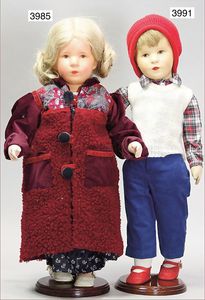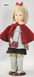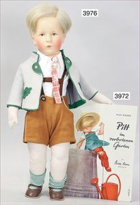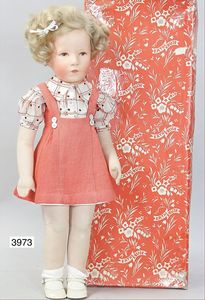 KÄTHE KRUSE Deutsches Kind, Ilsebill, Puppe Nr. 8, Stoffkopf, deutlich sichtbare Hinterkopfnaht, leicht eingeknickte Beine, mit abgenähten Kniekehlen, außergew. Orig.-Frisur, Orig.-Kleidung und -Unterkleidung sowie Schuhe, im Orig.-Kart., Kart. getaped
