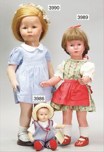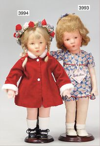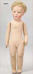 KÄTHE KRUSE ausgef. Stück der KK-Produktion, Puppe 1H, grüne gemalte Augen, Kopf farbl. etwas überarbeitet, breite Hüfte, Flickstellen an den Beinen, einzeln abgenähter Daumen, blonde Perücke, 35 cm, guter Zust., selten