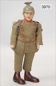 SCHILDKRÖT Einbindekopf-Soldatenpuppe, 26,5 cm, Stoffkörper, Orig.-Filzkleidung, Celluloid-Arme und -Beine, Teil der Sohle an einem Fuß weggebrochen, selten